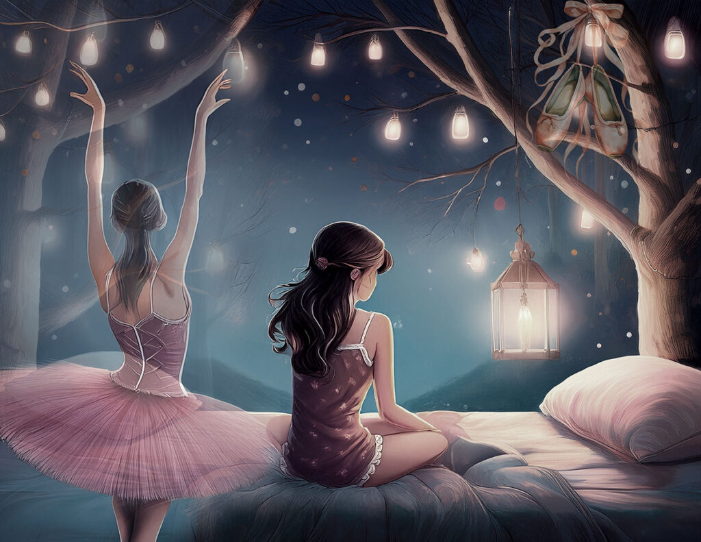 Maggie sat huddled on her bed with a blanket around her shoulders, looking outside, sighing every now and then. Street lamps lighted up the leafless tree branches. She liked to see if she could see shapes in them. She could almost imagine a pair of pink silk ballet slippers at the end of two long ballerinas’ legs, outlined by some tree branches. The scene was nearly comforting.