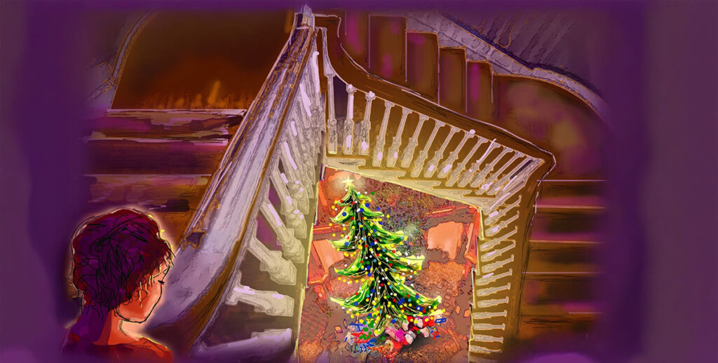 When Maggie woke up, she found herself alone in the bedroom. She wondered where all the other girls could be. So, rubbing her eyes, Maggie quickly exchanged her nightie for some blue slacks, a white T-shirt, and a thick wool pink sweater. She ran out into the hall at the top of the big staircase. She started down the steps and saw a giant Christmas tree covered with ornaments and colorful lights. Underneath were piles of beautifully wrapped packages with big bows. She could hear the girl’s twittering and excited giggling.